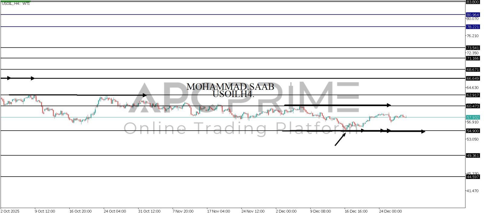 المنطقة الأهم (54.900) ثبات السعر أعلى المنطقة الأهم يتجه السعر إلى منطقة المقاومة (60.473) احتمالية الارتداد منها ممكنة ولكن باختراقها وإغلاق أعلى بشمعة أربع ساعات يتجه السعر إلى منطقة المقاومة (62.917)