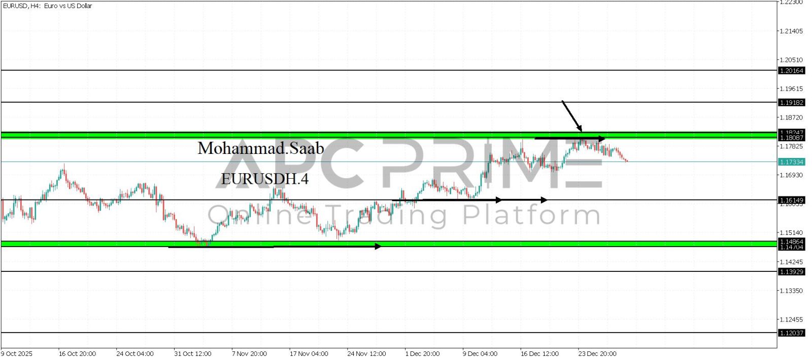 المنطقة الأهم (1.18087-1.18247) ثبات السعر أسفل المنطقة الأهم يتجه السعر إلى منطقة الدعم (1.16149) احتمالية الارتداد منها ممكنة ولكن بكسرها وإغلاق أسفل بشمعة أربع ساعات يتجه السعر إلى منطقة الدعم (1.14864-1.14704)