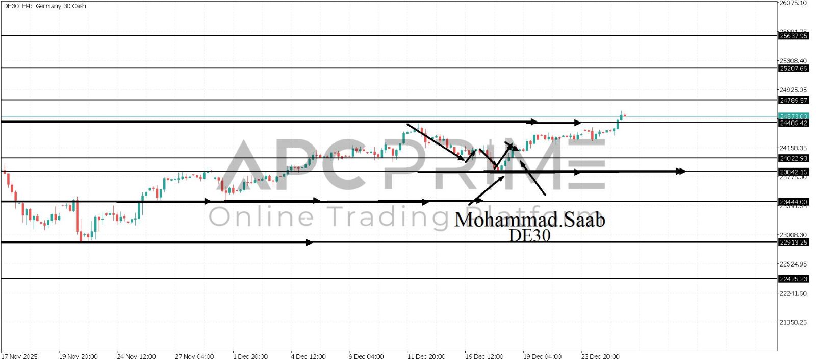 المنطقة الأهم (24486) ثبات السعر أعلى المنطقة الأهم يتجه السعر إلى منطقة المقاومة (24786) احتمالية الارتداد منها ممكنة ولكن باختراقها وإغلاق أعلى بشمعة أربع ساعات يتجه السعر إلى منطقة المقاومة (25207)