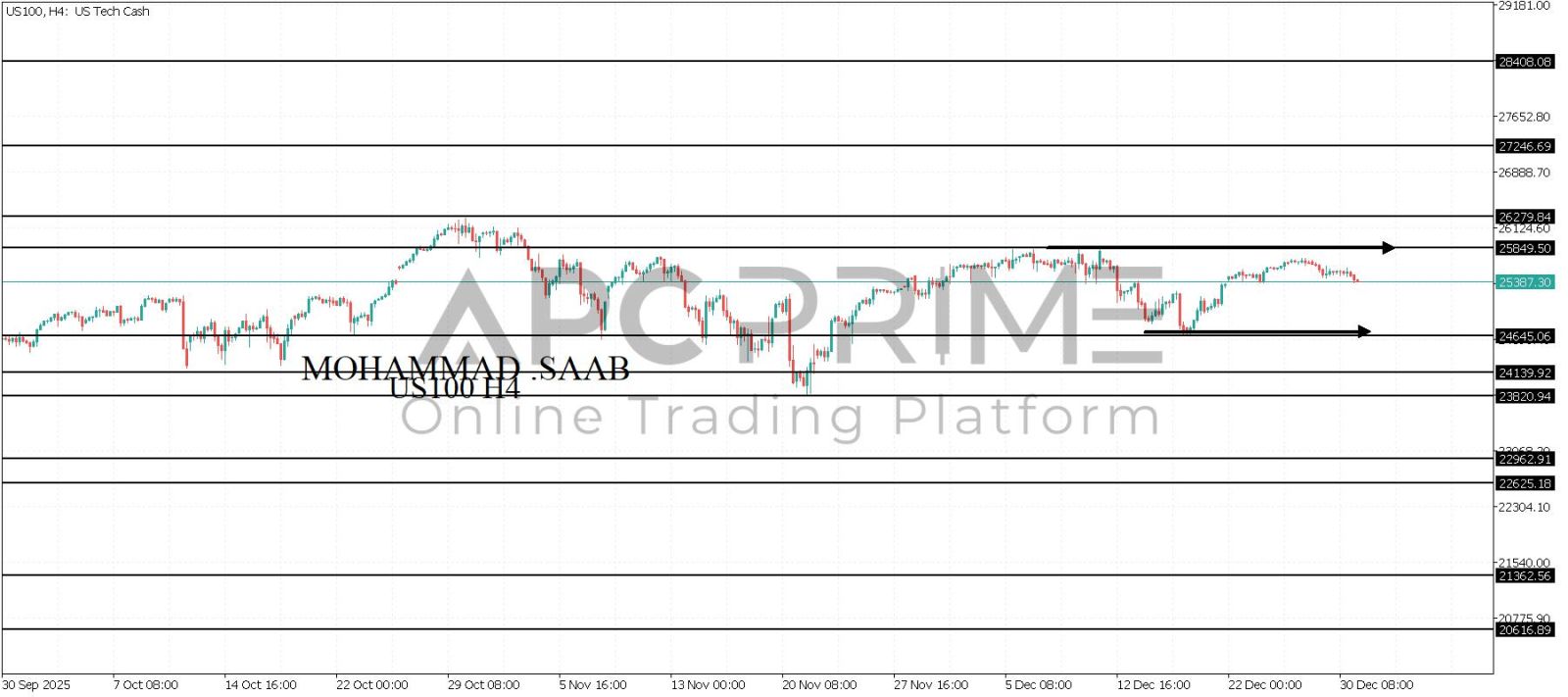 المنطقة الأهم (25849) احتمالية الارتداد منها ممكنة ولكن باختراقها وإغلاق أعلى بشمعة أربع ساعات يتجه السعر إلى منطقة المقاومة (26279) احتمالية الارتداد منها ممكنة ولكن باختراقها وإغلاق أعلى بشمعة أربع ساعات يتجه السعر إلى منطقة المقاومة (27246)